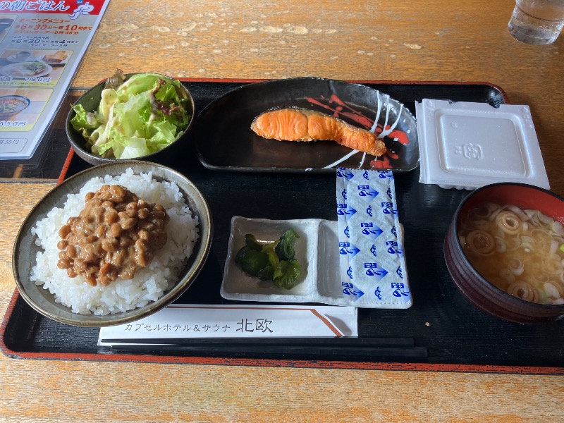 鮭は小さめだが、海苔と納豆でテンション上がる!味噌汁はネギたっぷりでおいしい!
