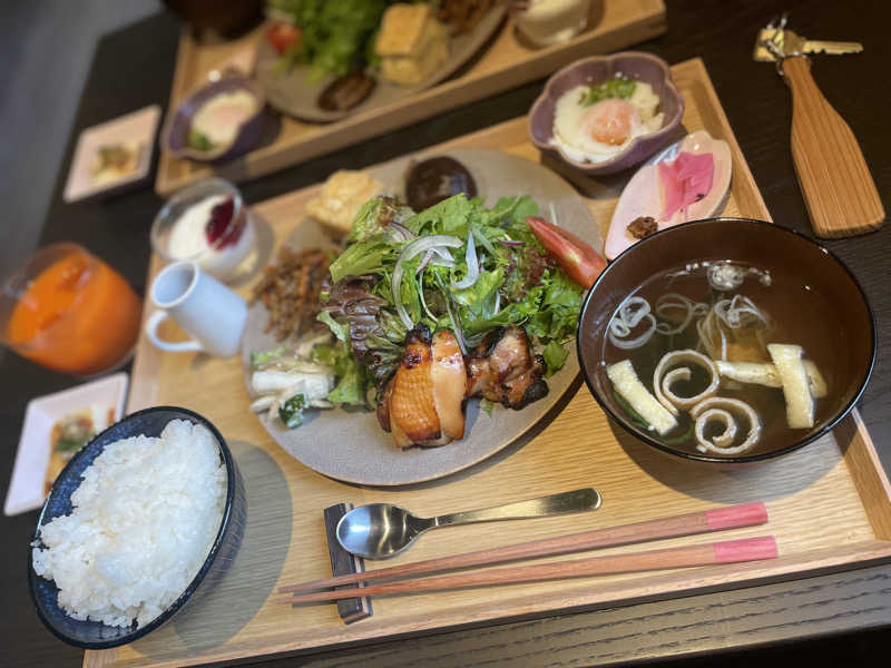 朝食には十分なボリュームで特に鳥が美味しかった。 好きな味噌を調合できる味噌汁バーも良かった。