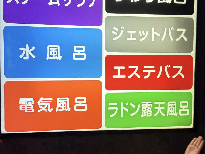 天然地下水をくみ上げて沸かしたお風呂。何だろう…不思議とお湯が軽く感じる。纏わりつく感じがなく湯上がりがさっぱりする水質に思えました。主浴槽は1mの深めの竹炭風呂、エステバス(ボタン式、深さが1m10cm)、座湯、全身ジェットバス。隣の赤いタイルの浴槽が電気風呂。広めの浴槽で強さも普通なので、中央にいれば快適に電気浴ができるはず。露天風呂はぬるめのラドン湯。TVもついているためか常連のおじいちゃん達が長湯する傾向(笑)