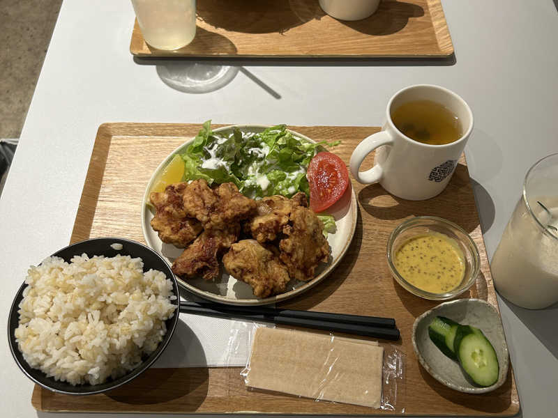 大きい唐揚げがサクサク だしの野菜スープも美味 ごはん大麦入りでヘルシー