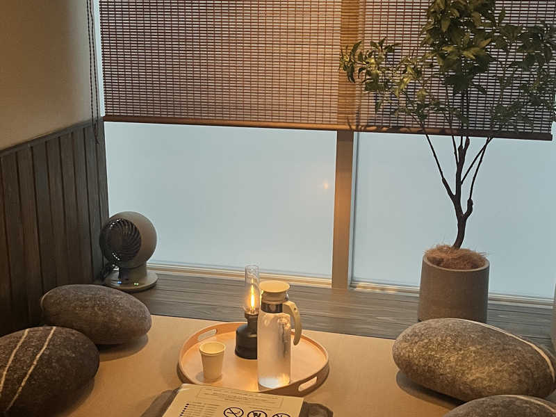 ちょっとした小上がりみたいな感じのところにランタンみたいな仄かな明かり、サーキュレーター、石になりきった布クッションがいくつか。