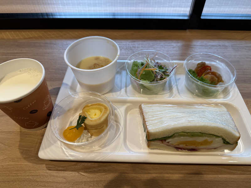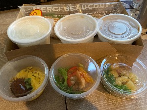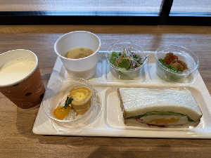 好きなサンドイッチ1つとデリ3つ選べます。カレーもお代わり自由でした