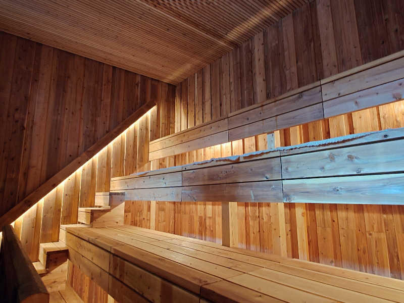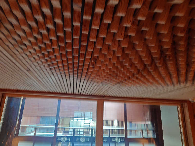 天井には3Dテクスチャのような滑らかな凹凸が設けられています。ロウリュの蒸気の撹拌に効果に効果があるのでしょう。