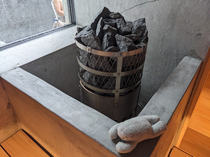 先客が出たのを見計らってロウリュ実行、ストーブ中央にお猪口くらいの受けがあって、ロウリュしなくてもここで加湿されてるのかなぁ?石にアロマ水をかけるとコンパクトな室内なのもあってすぐに蒸気が降りてきてアッチアチからの汗びっしょり!