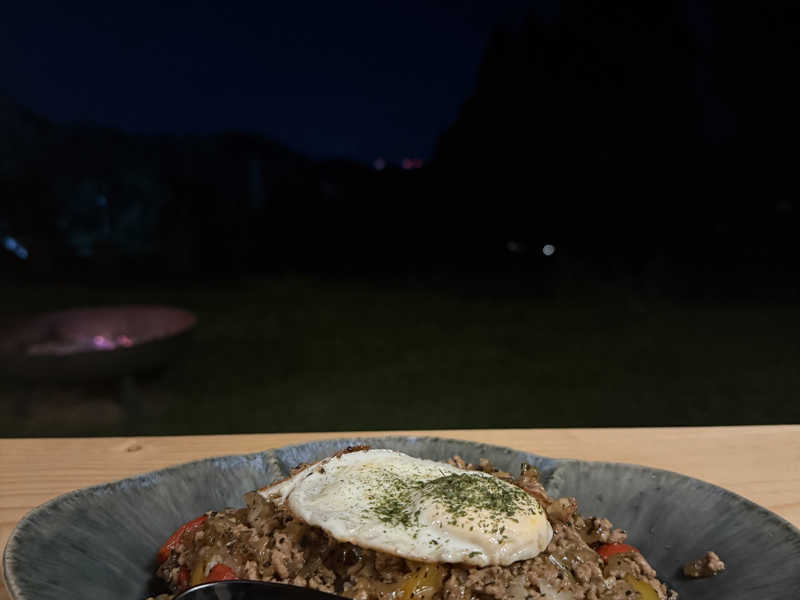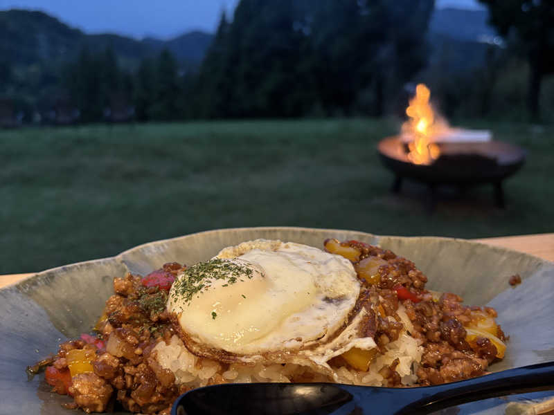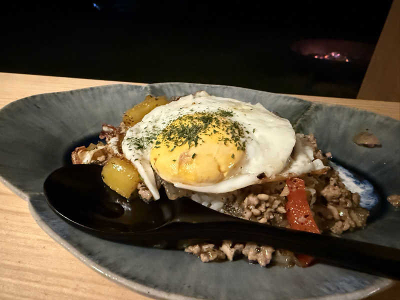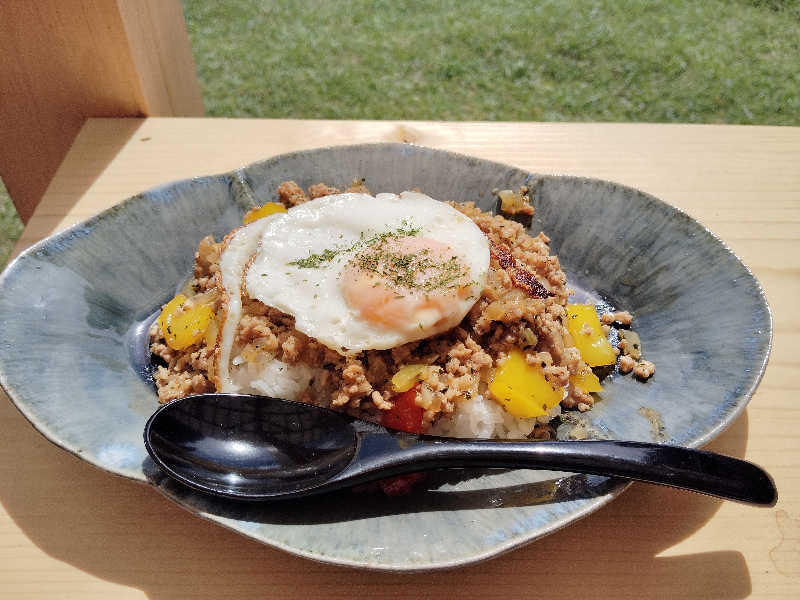 サ飯はガパオライスで、事前にサウナ終了のタイミングで注文可。日本米だけど本格的で美味しかった!
