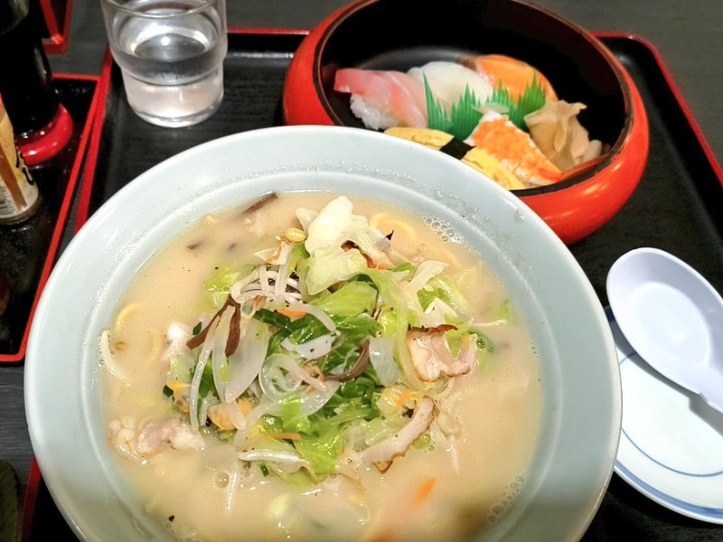 先ずは2階の食事処で名物の小浜ちゃんぽん&握り寿司を頂く。海を見渡せる席で美味しく頂けた。んで会計時に温泉に入りたい旨を伝えるとレシートに日付印を押して1階のフロントに渡して下さいとの事