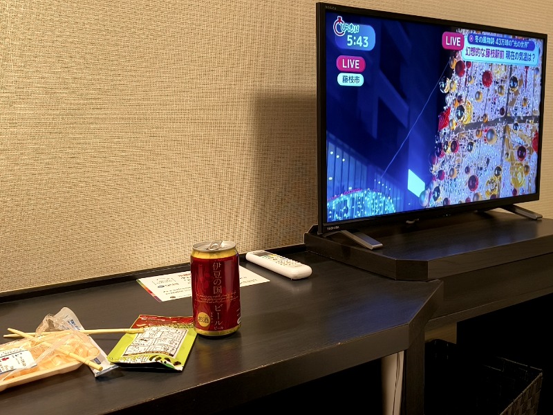 湯上がりはドーミーイン名物の無料アイスを頂き、部屋でSATVの『とびっきり静岡』を観ながら部屋吞み。肴は静岡名物の『バリ勝男クン』など。旅先や出張先で呑みながら観るご当地ワイドショーは密かな楽しみ