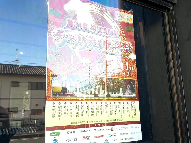 帰りに館内のポスターを見たらテレ玉の正月番組『埼玉政財界人チャリティ歌謡祭』の開催告知が出てた。もぅそんな季節かぁ…って眺めてたら、何とココの社長が出場するとか。おめでとうございます
