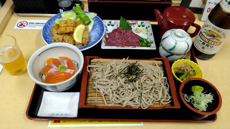 湯上がりは大広間で30周年記念メニューの信州漫喫セットを頂く。馬刺しや山賊焼き、信州サーモン丼、ざる蕎麦などセット。お得でうまうま。食事処、いつの間にかモバイルオーダーに変わったのね