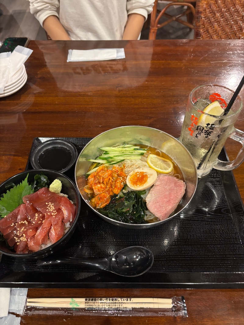 冷麺辛さがちょうどよい。マグロ丼も安定の旨さ。ハイボールも沁みる。