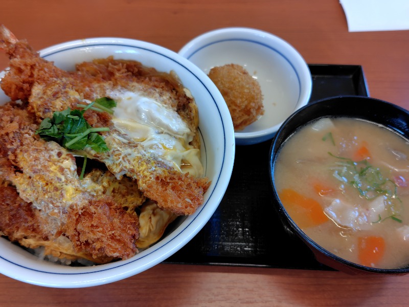 揚げたてのカツがサクサクで、衣の香ばしさ、海老フライとロースカツ丼が体に染み渡る。