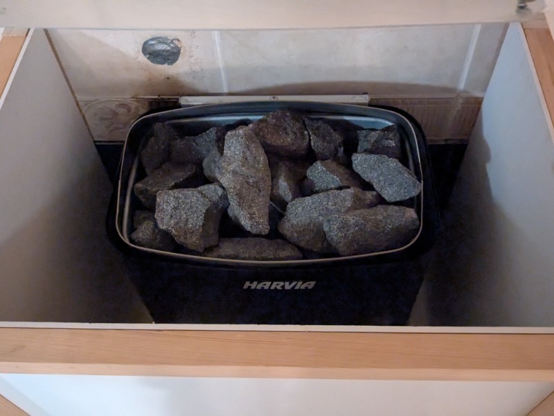 浴室内にサウスペース。元はスチームサウナだったのかな?2段式で定員2名。ストーン対流式。