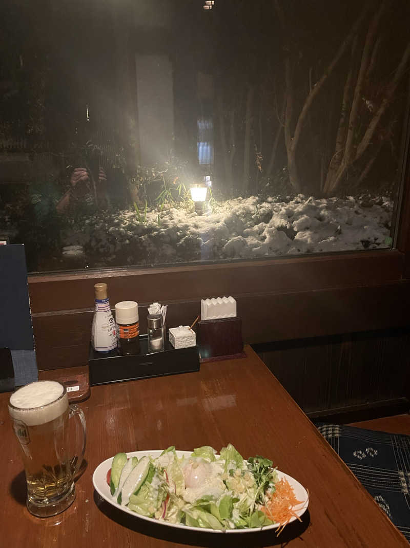 露天にて、木々の上に乗れる残雪に「いとをかし」と呟きつつ、一時間強たしなみながら、いつものビール&シーザーサラダセット(そんなセットはない)で、つまを待つわたし。