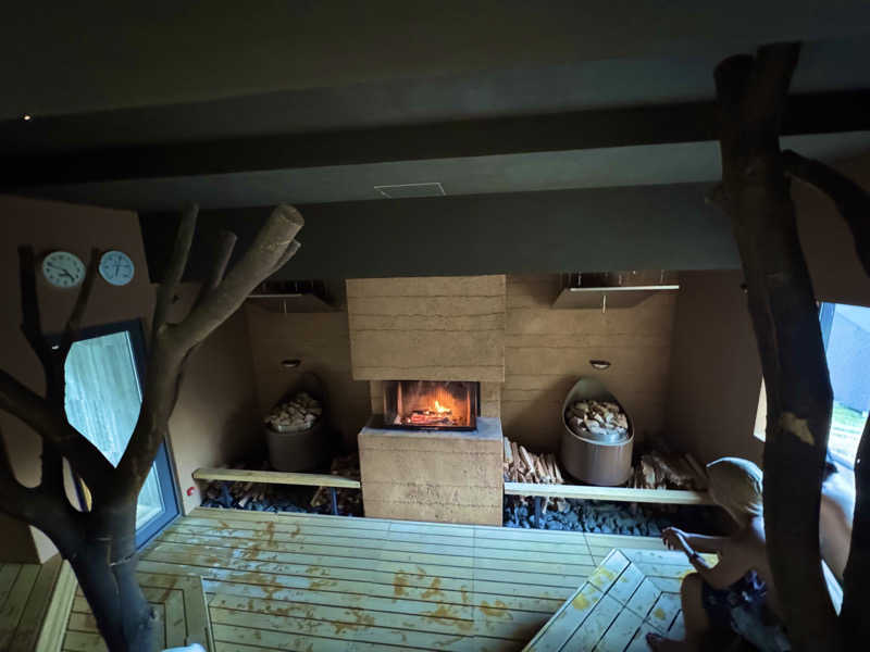 山サウナは、中に木もあって、暖炉もあって、まさに山の中の焚き火サウナで薪の香りと炎のゆらめきに癒される!