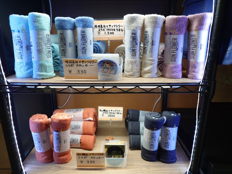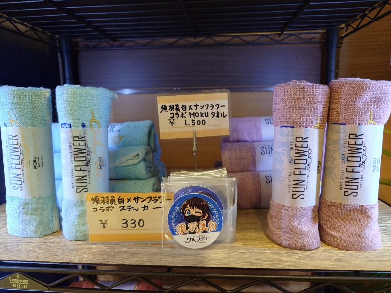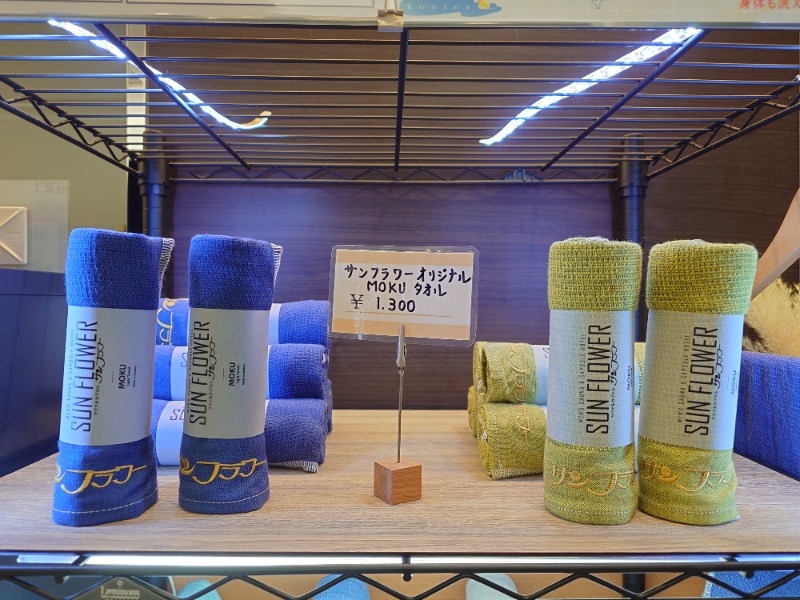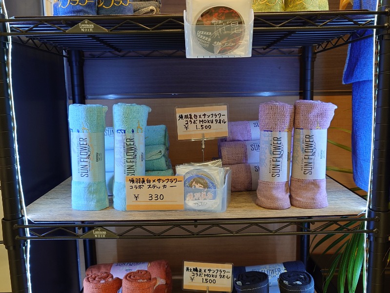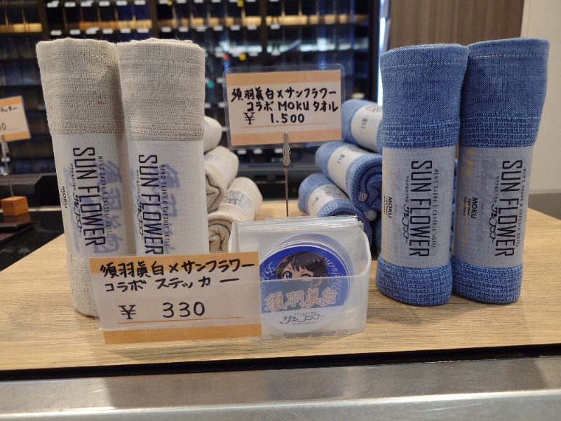 (20時回でお話されたサンフラワー巣鴨さんのフロントには色とりどりの🍁🦆🍁=MOKUタオルやステッカー✨先月、10月22日(水)須羽眞白さん熱波イベントの日に発売開始の✨新色MOKUタオル2種(ブルー・アーモンド)を購入♪)