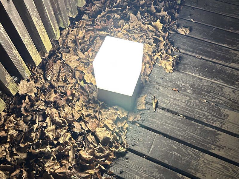 サウナ横ウッドデッキ、木のイスにて休憩…