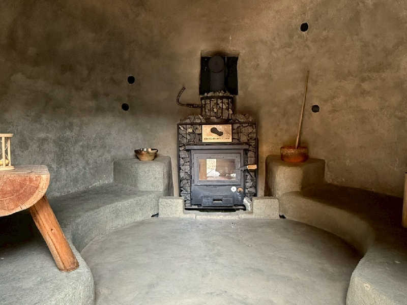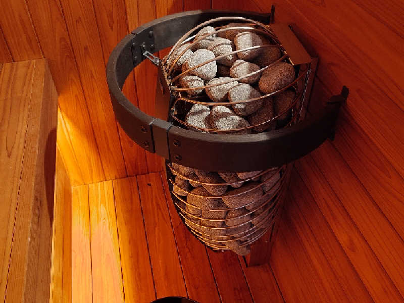食後のバーベキュー後に茶のサウナへ。朝宮茶のロウリュの香りが絶品。HARVIAストーブに、鉄製の急須が置いてあって、組紐ぽい。このストーブは、時間設定すれば実質24時間入れるやつ。