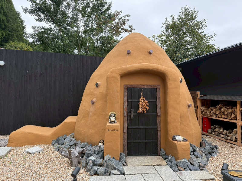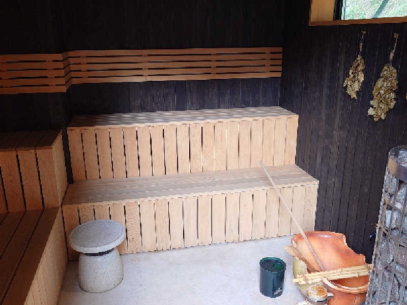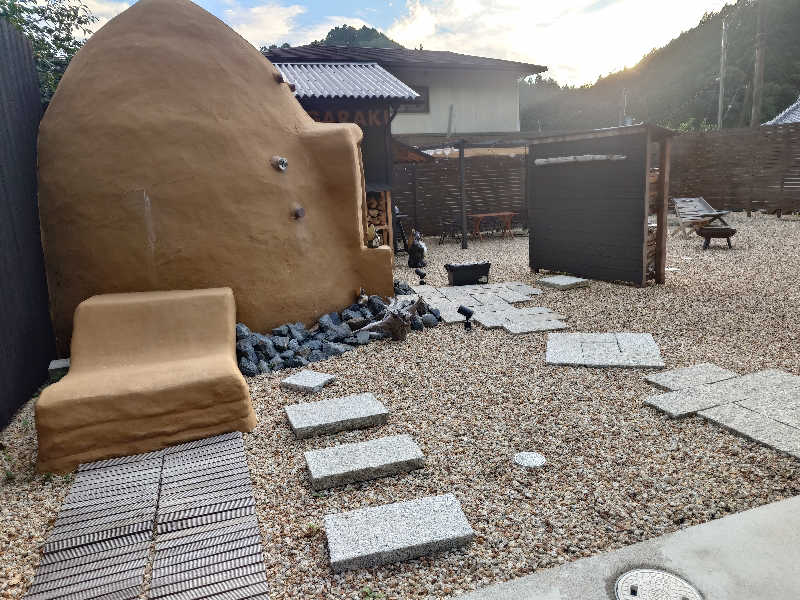 素晴らしい施設に出会ってしまった。。一棟貸しサウナいくつも行ってきたが、トップクラスだ。サウナ最高なのが素晴らしいしが、ホスピタリティ高いのも好感が持てる。支配人のサウナと信楽への愛情、熱意も伝わってくる。施設内は清潔感があって、家具インテリアにこだわりを感じる。信楽らしいたぬきの置物や壺もいい味だしてる。『狸道』個人的に好き。飲料水水はウォーターサーバーで飲み放題!!意外とこれはない!!(氷も無料!)、朝宮茶も一部無料。お茶は淹れ方まで丁寧に書かれてある。お酒やポカリ、追加の焚き火木材などはpaypayで追加料金必要だが、それはまー当然の範囲。とどめてくれているのを感じる。(1棟貸しは、何をするにもQRコードで追加料金かかりすぎるところは、結構冷める。開放感味わいに来てるのに。。となる。)サ室は『茶のサウナ』と『土のサウナ』の2種類。どちらも、好きな時間に入れる。まずは薪サウナである土サウナを堪能。支配人と奥様の手製だそうで、関西で類似のサ室はない。その外観フォルムと室内の雰囲気、室内の香り、、あーもうたぶんこれは最高だなと思わせてくれる。ロウリュの仕方も、すごく丁寧に教えてくださる。実際入ってみたが、熱さに丸みがあるというか、独特の感覚だった。水風呂はしっかりチラーで温度管理13度。サ室と水風呂の温度差もしっかり計算されている。完璧言う事無し。外気浴は、土サ室外観左につながる、土ととのい椅子へ。これがいい!!固いけど、体の熱さが吸い取られている感覚、そして青空!こりゃ素晴らしい!冬は冷たすぎて寝れないそう。土サウナは薪が切れると、サウナ仕上がるのに体感1時間くらいはかかりそう(もっとか?)で、注意必要。