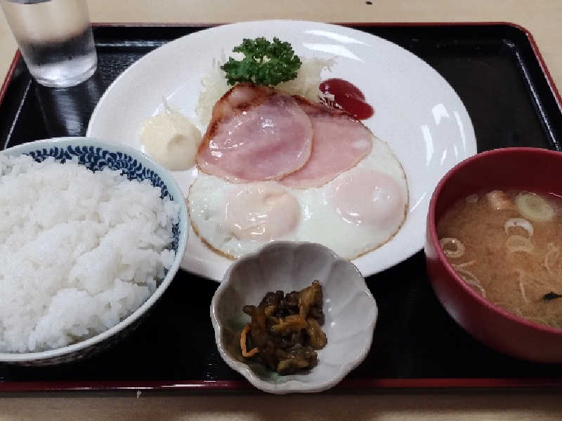 朝食はハムエッグ定食。久しぶりに目玉焼き食べた気がする。