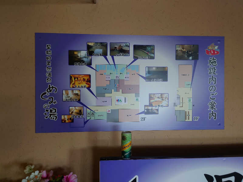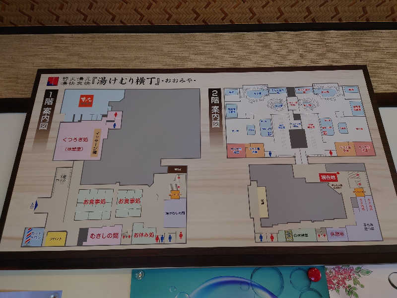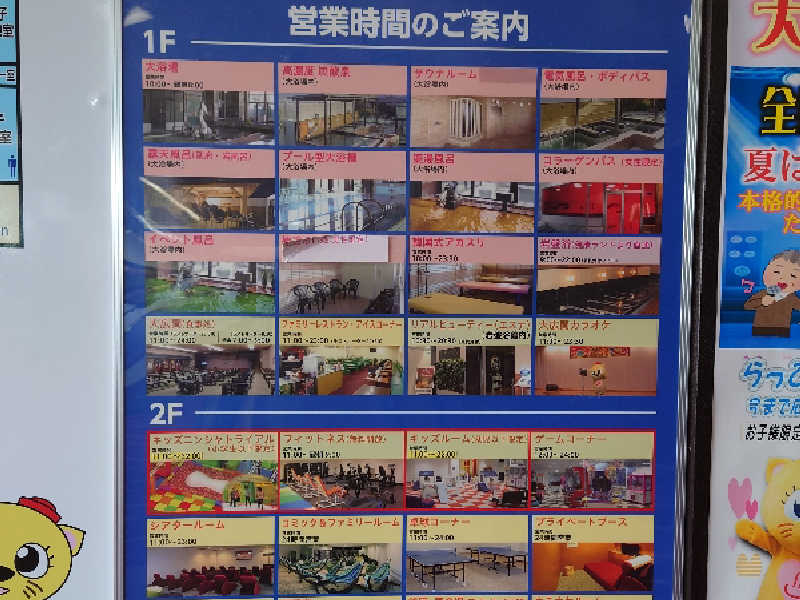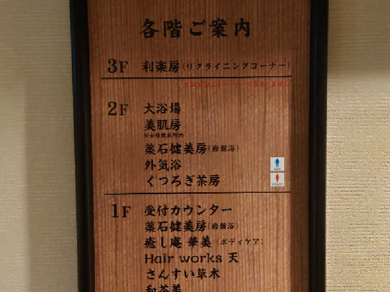 1階にフロント、浴場、無料休憩所、カプセルルーム、2階にホテルと食事処、マンガゲームコーナーがあります。