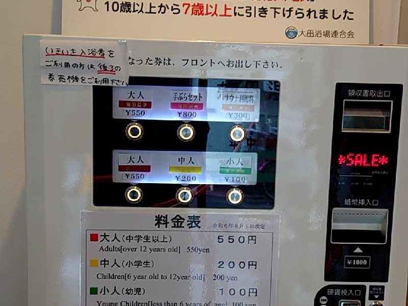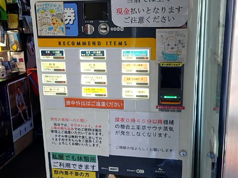 券売機でカプセル宿泊のチケットを購入!館内とタオルセットは別途チケット購入が必要⚠️早速浴場へ🏃