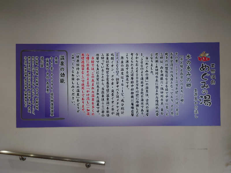 泉質は「ナトリウム炭酸水素塩・塩化物冷鉱泉(低張性、弱アルカリ性、冷鉱泉)」pH値は7.9