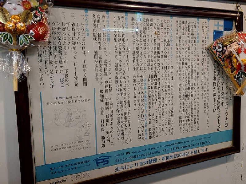 先客が帰られたとのことで、ここから貸切です!プライベートサウナです🤗正直不安はありますよ?でも満喫しないとね。サウナはメトスの対流式の2段式、88℃から110℃までのかなりの振り幅となっています(張り紙では約90℃〜115℃になるそう)。温度計も見たことない年代物。対流式ですが、ストーンに水かけ禁止。反熱板がとても低い位置にありました。ストーブはよく見ると入れ替えた感じ。12分計はなく、置き型砂時計を使います!テレビは14インチのブラウン管、こりゃ最高😂