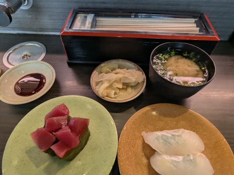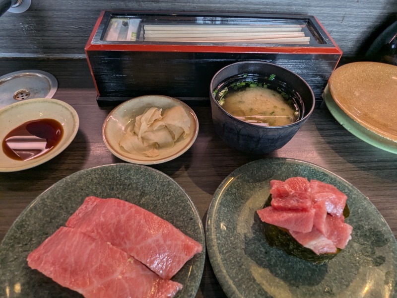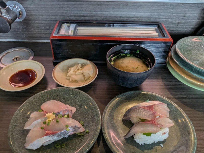 ここ来たらまずは売り切れ必須なので関あじ、関さば、中トロは抑えなくてはならない。