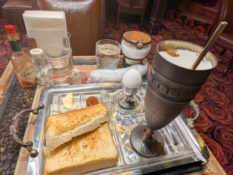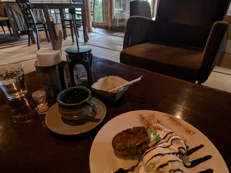 この天気なら空いてると読んで来たけど誰もいない、コスタリカ+フレンチトースト。フレンチプレスにして貸し切りで楽しめた。