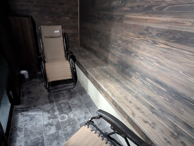 常連さん達が揃った段階でおばちゃんから追い薪のコール、昨日同様パワーが半端ではなく一気に47℃オーバー。上半身も足も痛ぇ、焼ける!最高!