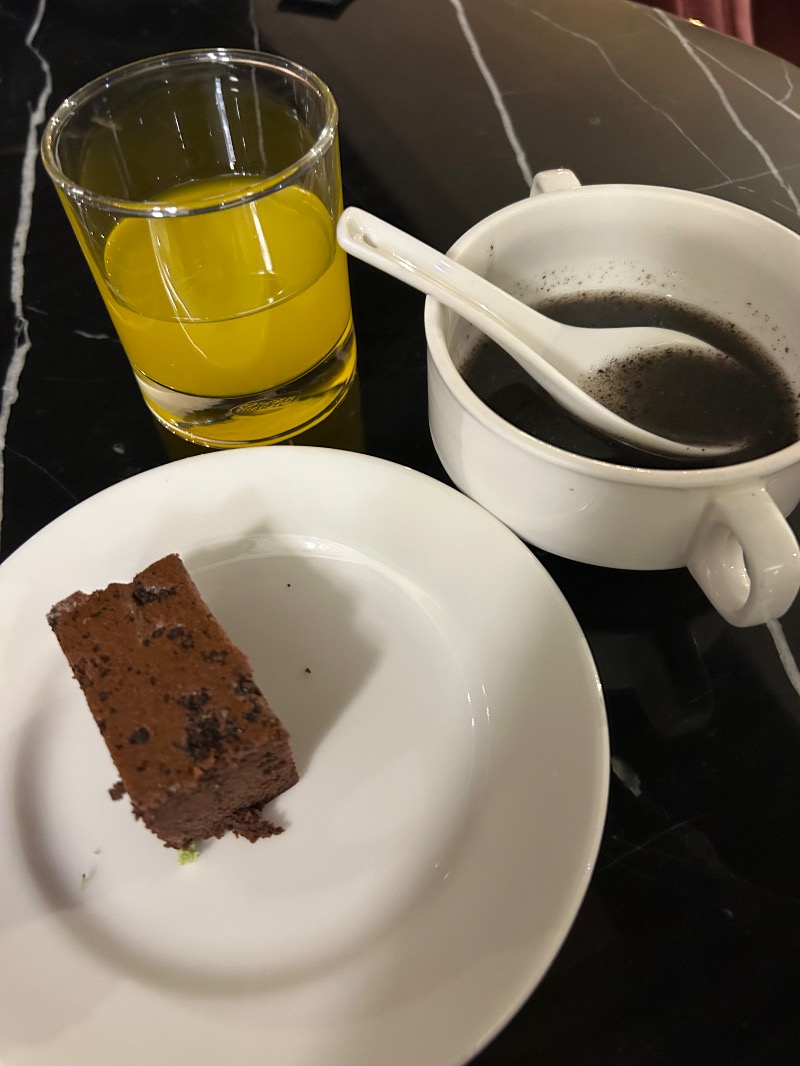 飲み物がコーヒー、紅茶、緑茶、オレンジジュース。デザートは、チョコレートケーキと甘い黒胡麻のスープ。