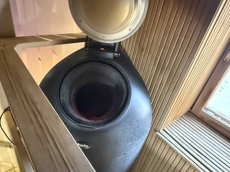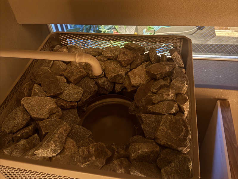 ロウリュはストーブ上部にある蓋が開いてるところへ投げ込むイメージ…