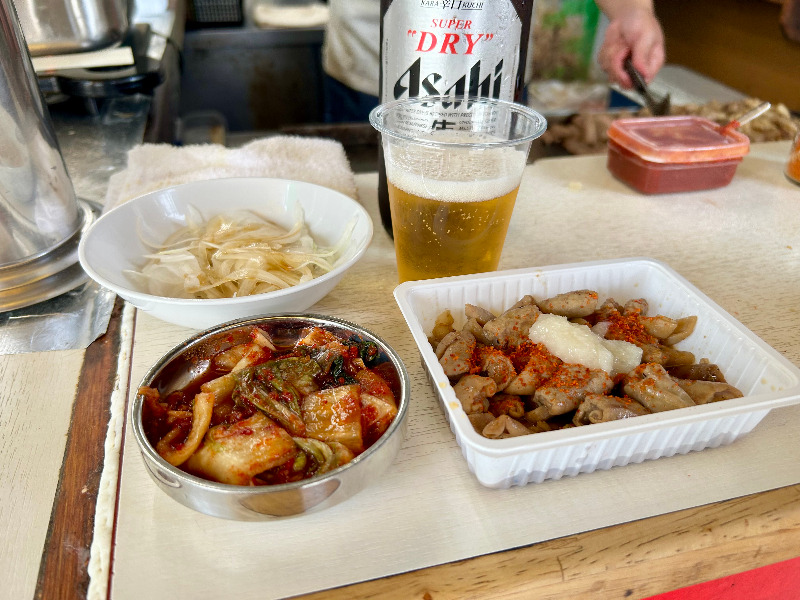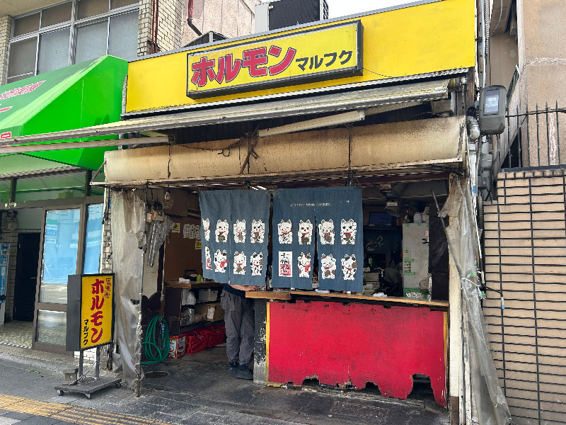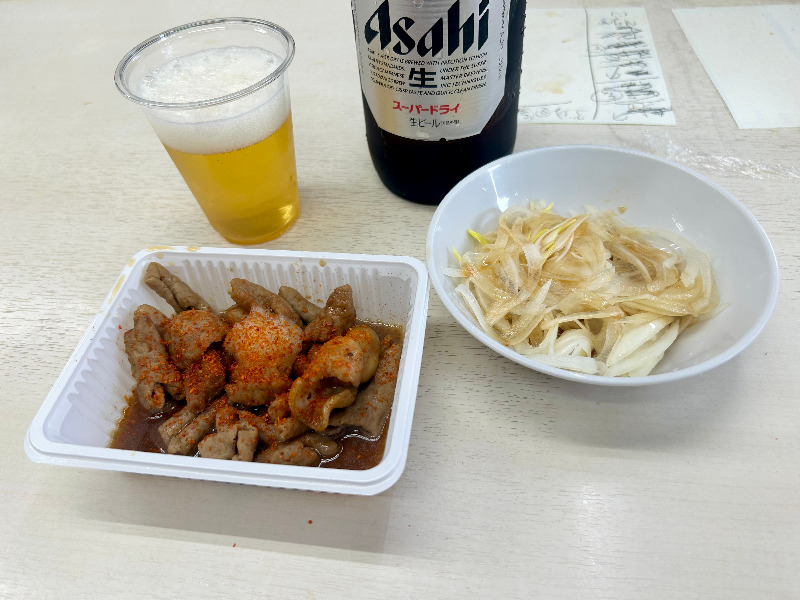 ( ’・v・)8:50イン!スタッフアウフグースを含む5セットで、でろんでろんになり。サウナ後は「ホルモンマルフク」さんへ!さすがのマルフクさんも、平日の朝なら空いている。ホルモン+瓶ビール+キムチ+オニオンスライスの¥920セットを注文。日本語ペラペラ黒人さんとギャルの会話が楽しい。ひときれ偶然に混ざっていた「アブラ」がおいしかった。次回は「ホルモン+アブラ」で注文してみよう。