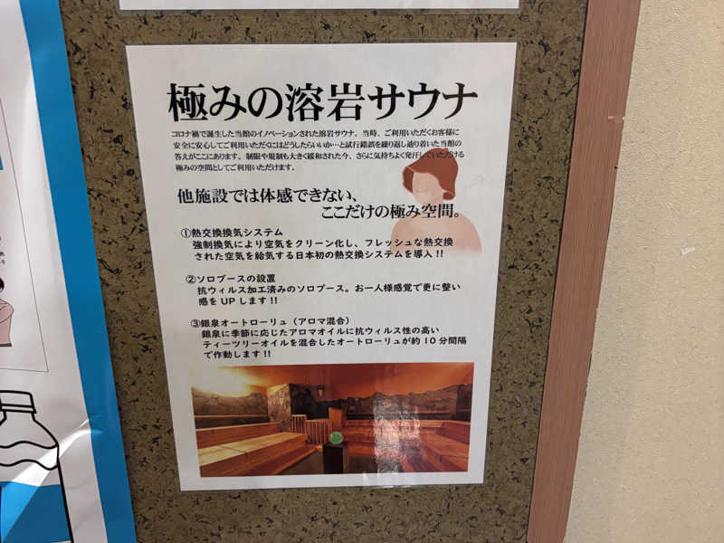 マグマスパ式サ室。キャパは3段25名ほど。赤坂のスゴイサウナと同じくらい。サ室の温度は70℃前後だがマグマスパ式サウナなのでびっくりするくらい発汗する。60分の利用だったので2セットしか入れなかったが、オートロウリュ1回、店員のウォーリュ(壁に水をかけるロウリュ)2回に遭遇できたのはかなり嬉しい。オートロウリュは程々に熱くて自分好み✌️