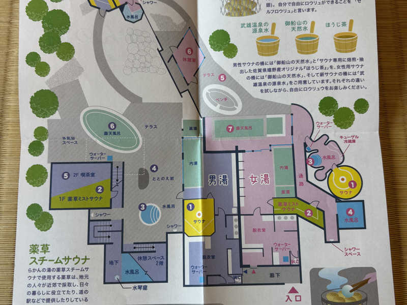 男湯2つ女湯3つ。女湯の方が全てサ室の近くにあるので水風呂の動線が良い。武雄温泉の源泉を冷却しているので長く入れる(気がする)。男湯の水風呂は広くて深いのでストレスフリーで良い!