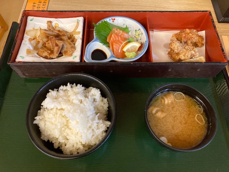 生姜焼き🍖サーモン刺身🐟唐揚げ🍗美味しゅうございました😋