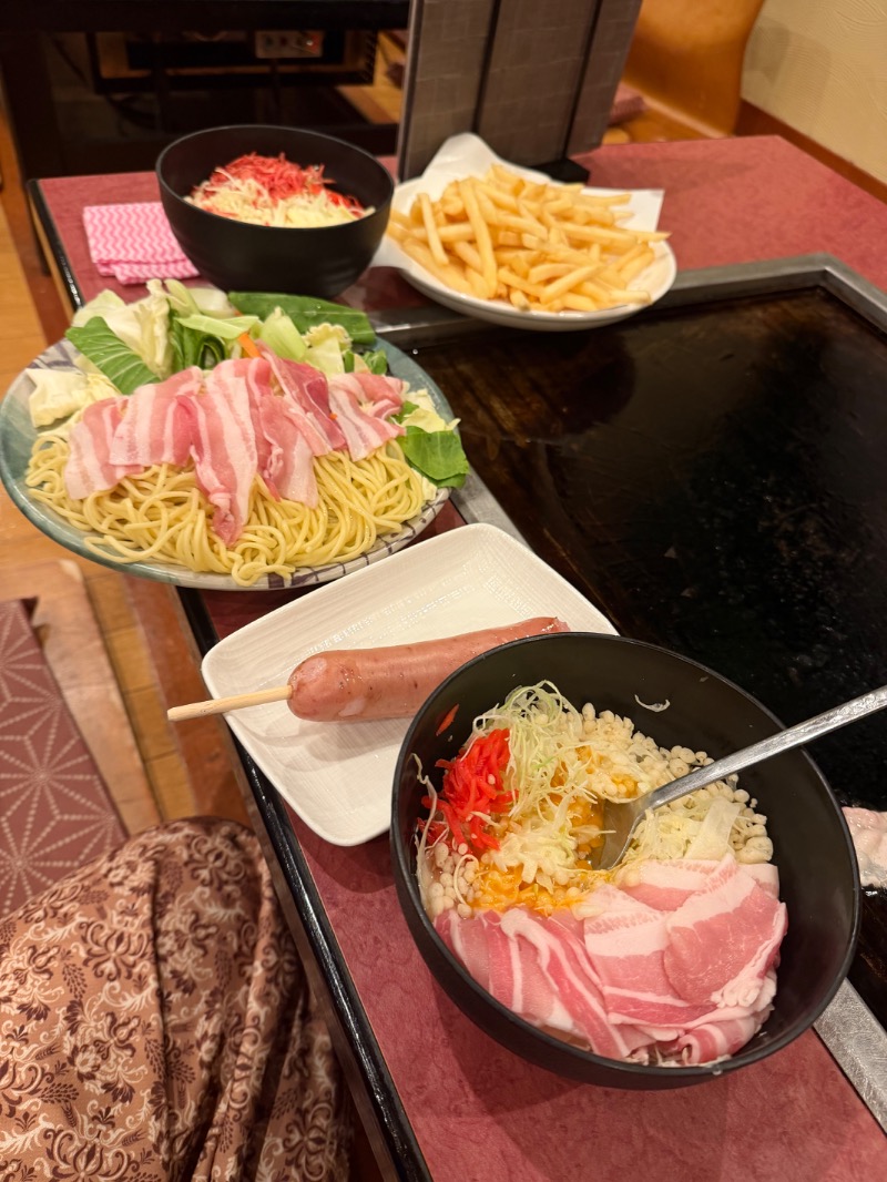 17:00 ゲストアウフ岩盤浴18分からのお食事。やきそばやいてて指やけどをする。