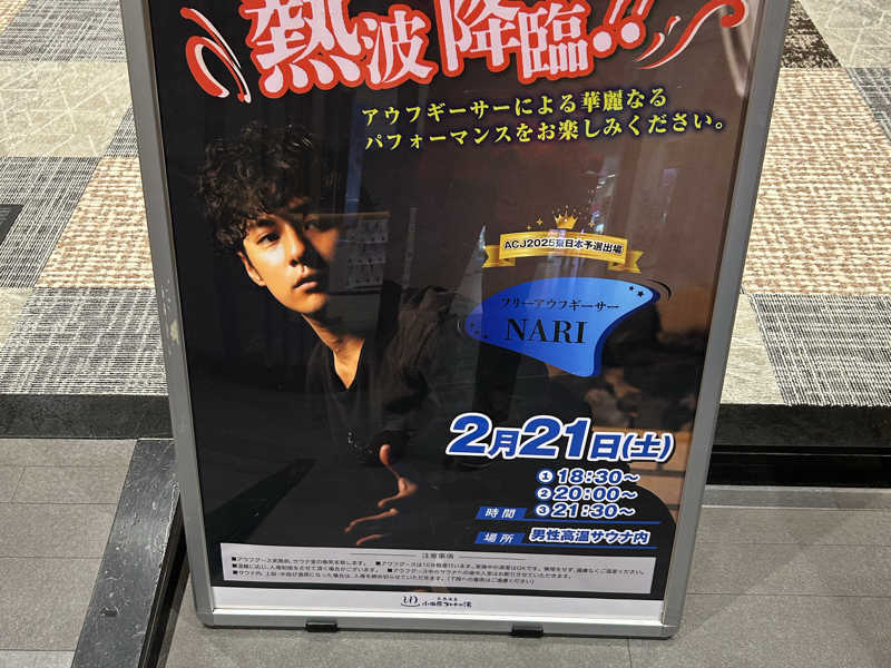 20時〜のアウフグース担当はフリーアウフギーサーのNARIさん。なんとかラスト一名に滑り込めました。洋楽三曲。一曲に対して香りの違うキューゲル一つをサウナストーンへ。「本来アウフグースは痛いものじゃないんです」と。確かにめちゃくちゃ痛くなく気持ちいい汗のかき方。本来の理想の発汗かもしれない。ロック調の曲のサビでは、激しくタオルをお客様に。そしてある時には華麗なタオル捌き。そしてお客様に手拍子を煽ったり、ほんとにアウフグースショーを感じた。あとあとちゃんとポスターを見たらACJ2025に参加されていたとのこと。そりゃ素敵なアウフグースだったわけだ。