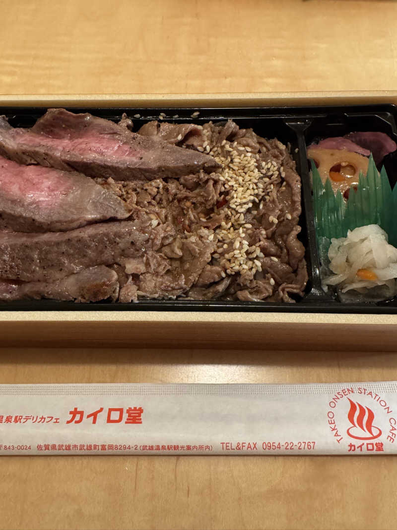 武雄温泉駅で買ったお肉の弁当が当たり🎯とてもおいしい!次回も晩御飯にこのお弁当買うわ😄🍱❣️