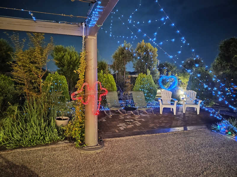 アディロンダックチェアが3脚とラタン風の椅子が1脚🪑外は見えませんが、周囲の壁にライト設置して点灯させ、一見すると夜景風にしている所が憎いです💡竹の意匠もいい雰囲気👍