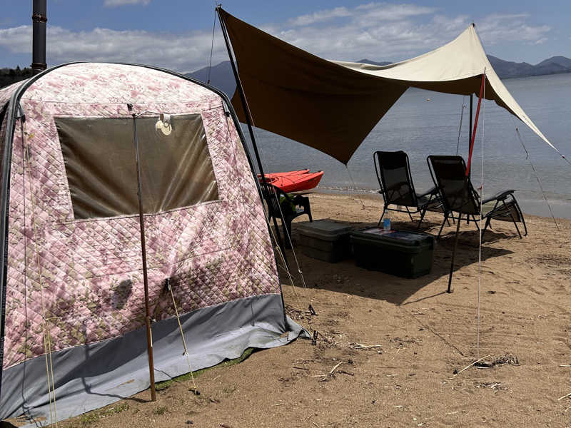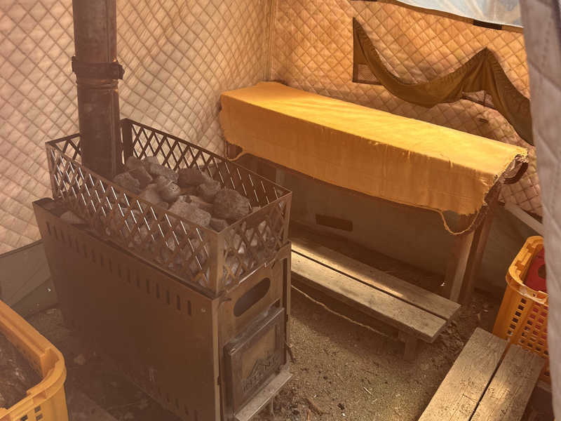 テントサウナの最後のペグの打ち込み儀式を終えて、薪の入れ方やタイミングの説明をソワソワしながら聞き、初テントサウナ開始!!