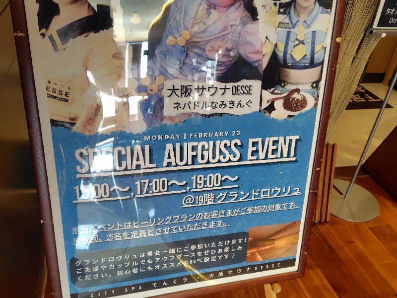 19階が入口受付、20階に男女浴場・サウナ。アウフグースは別料金でヒーリングスパ料金を支払い、19階のグランドロウリュサウナで行われます。