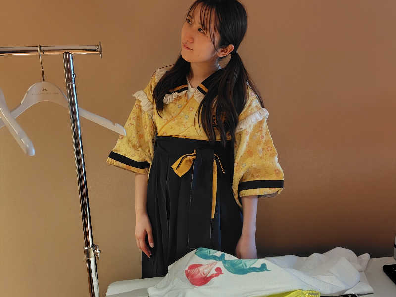 きんぐさんは白のネパドルTシャツ、水色スカート。