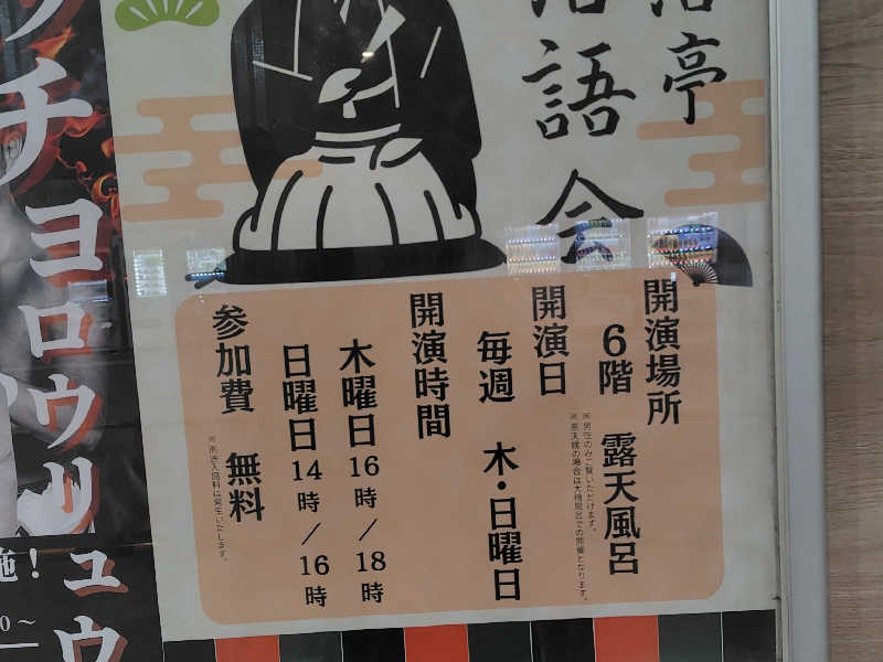 今日は日本風呂エリアの露天風呂前で落語なんぞやってましたが、30分くらいあるというのでお風呂入ってたらのぼせちゃう。遠慮しました。