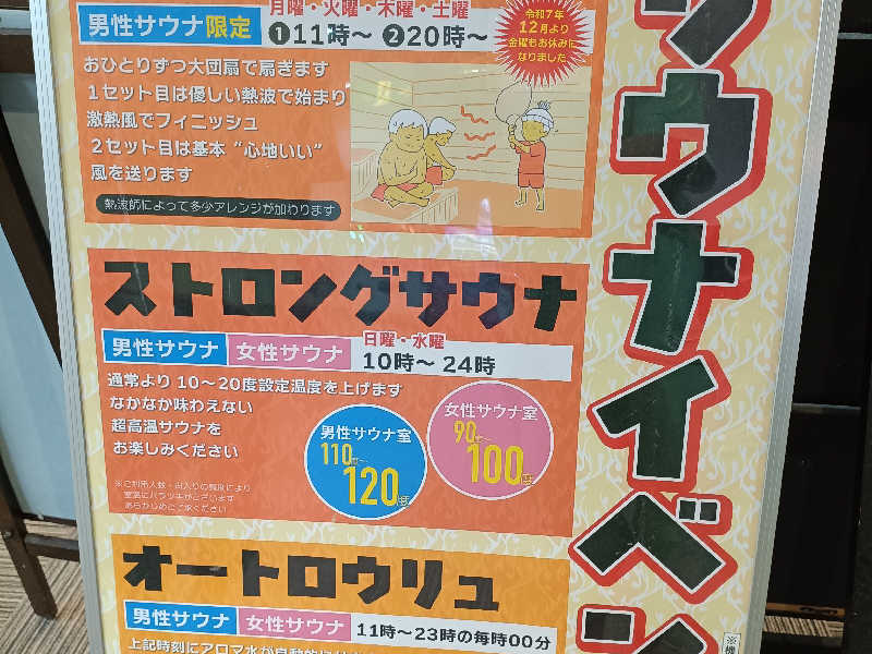 20時過ぎにイン。たまたま空きを引き当てて駐車、いきなりラッキー。偶数日で今日は左。高級マッサージ機で昇天してる凡愚さんを発見し、少しお話してから脱衣所へ。