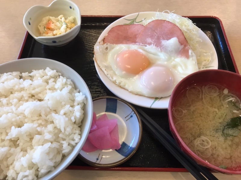 サ飯は館内のサウセン食堂で朝ハムエッグ定食!