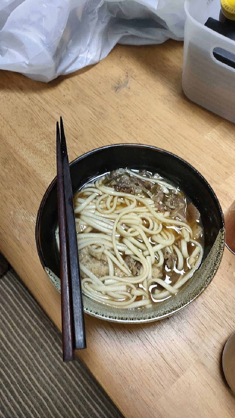 牛肉と油揚げとネギを煮詰めて冷凍してたヤツを入れて食べたら、ウマイ😋