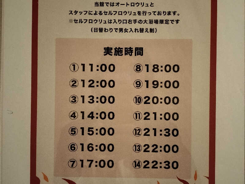 オートロウリュは毎時0分と30分(と書いてあるが実際は3分と33分だった)。
