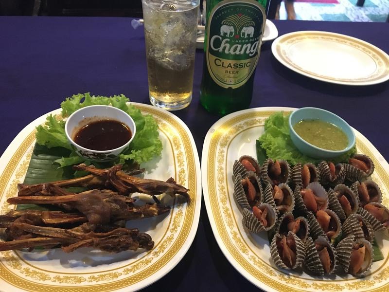 有馬から徒歩1分のhappy某なるイサーン 料理屋で、アヒルのクチバシ揚げと、茹でミニ赤貝。