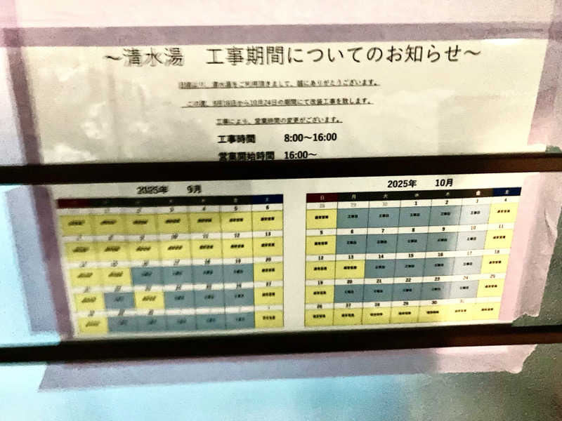 9/16-10/24の「平日」は、建物工事で、営業時間が、1600-2230 になるとのこと。 土日祝はいつも通り、0830-2230が営業時間。 脱衣所の脱衣カゴを入れる棚が、工事で撤去されてた。貴重品を入れる鍵付きロッカーは今までどおり使える。 もちろん、お湯もサウナも水風呂も、いつも通り良かった。
